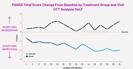 - Change from baseline in PANSS total scores favored UZEDY (-4.10) over placebo (+1.11) at the end of treatment1